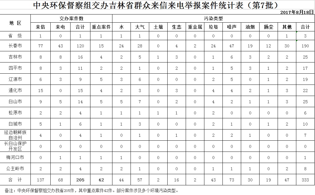8月18日16:00,我省接到中央环保督察组交办的第七批案件,共计205件。其中,重点案件42件。长春市120件(重点案件15件)、吉林市16件(重点案件4件)、四平市11件(重点案件2件)、辽源市9件(重点案件5件)、通化市15件(重点案件4件)、白山市14件(重点案件5件)、松原市4件(重点案件1件)、白城市6件(重点案件1件)、延边州4件(重点案件1件)、梅河口市1件(重点案件1件)、公主岭市4件(重点案件2件)。另有交办省级办理案件1件(重点案件1件),涉及辽源市、通化市。