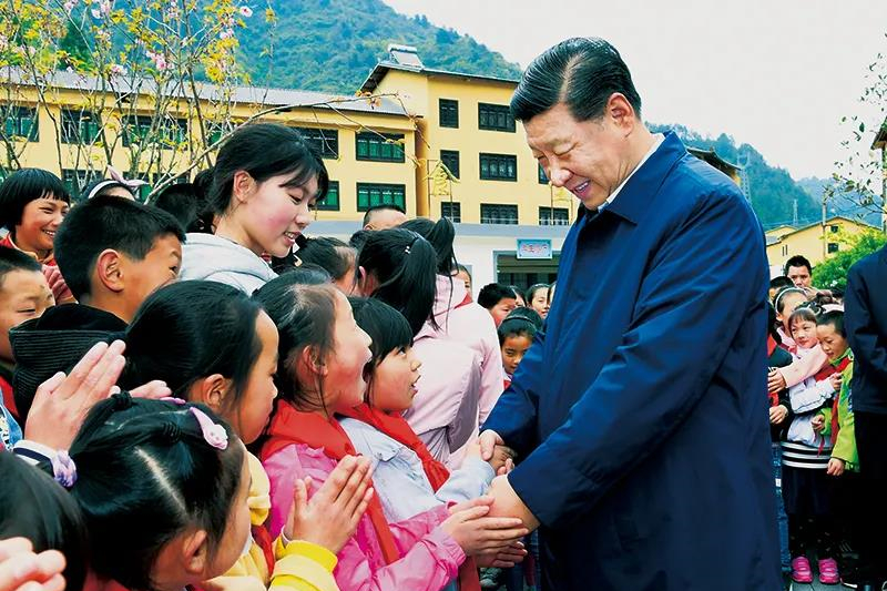 2019年4月15日至17日,习近平在重庆考察并主持召开解决“两不愁三保障”突出问题座谈会。这是15日,习近平在石柱土家族自治县中益乡小学同学生们交谈。
