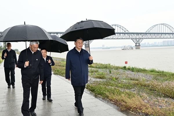 10日下午,习近平来到九江市考察调研。在长江国家文化公园九江城区段,习近平登上琵琶亭远眺长江,冒雨沿江堤步行察看沿岸风貌,仔细询问长江水位、水质、航运、防洪、禁渔等情况,听取当地崩岸治理、航道疏浚、岸线生态修复等工作进展介绍。习近平指出,长江是长江经济带的纽带。无论未来长江经济带怎么发展、发展到哪个阶段,都不可能离开长江的哺育。要从人与自然和谐共生的生命共同体出发,着眼中华民族永续发展,把长江保护好。